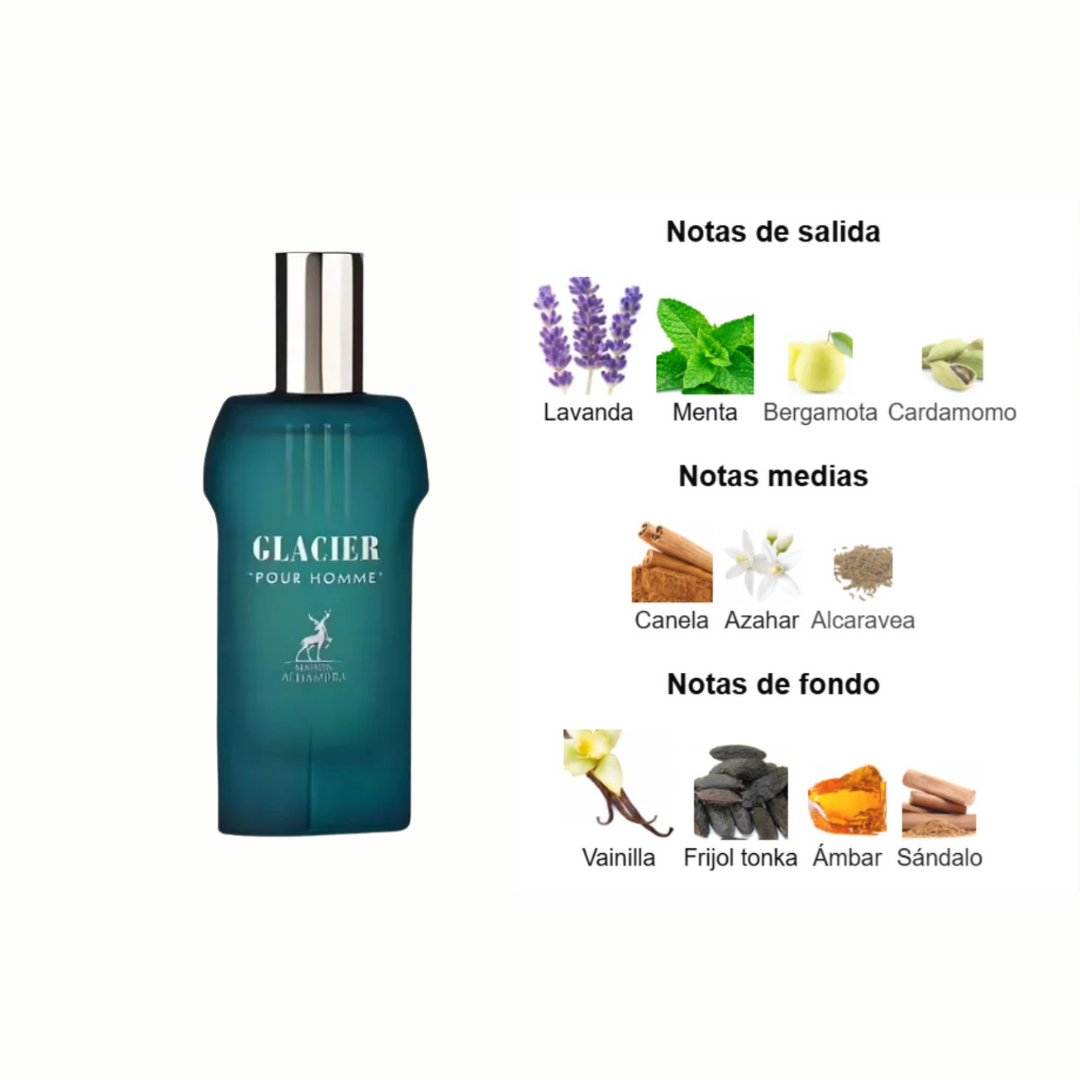 Glacier Pour Homme de Maison Alhambra es una fragancia unisex lanzada en 2023, pensada para quienes buscan una esencia intensa, fresca y seductora. Su composición combina frescura aromática, especias cálidas y una base dulce y envolvente, creando un equilibrio magnético entre energía y elegancia.