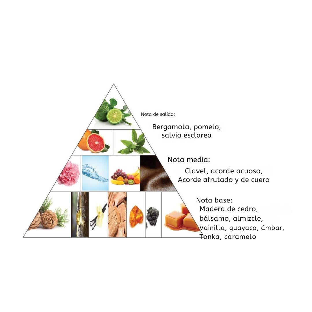 Notas de Fondo: Una base cálida y envolvente con madera de cedro, bálsamo, almizcle, vainilla, guayaco, ámbar, haba tonka y caramelo, dejando una estela duradera y elegante.